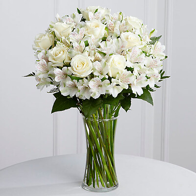 The Cherished Friend Bouquet offers comfort and sympathy in the time of grief and loss. Bright white roses and Peruvian lilies are accented by lush greens and gorgeously arranged in a clear glass gathering vase to create a bouquet that will bring peace and show how much you care.