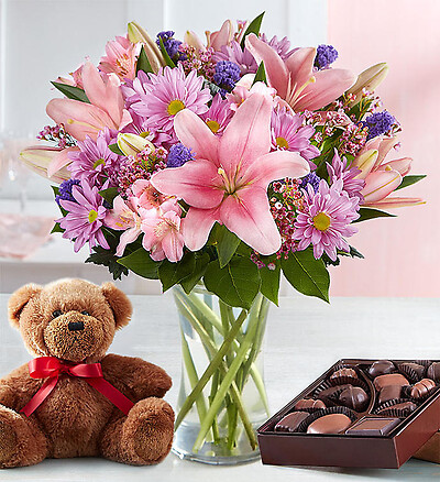 Three heartfelt surprises - one truly enchanted evening! This irresistible Valentine’s bundle starts with our beautiful gathering of blooms in shades of lavender & pink. And because one great gift deserves another, we’ve paired our flowers with a huggable teddy bear and delectable chocolates. It’s everything you need to surprise a Valentine’s sweetie.