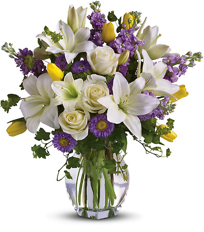 This white, lavender and yellow bouquet includes white asiatic lilies, cream roses, yellow tulips, lavender stock, lavender matsumoto asters and greens including bupleurum, ivy and seeded eucalyptus. Delivered in a gorgeous reception vase.
